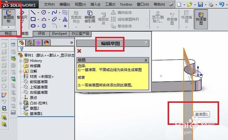 8、如下图所示,创建草图。点击工具栏中的“草图绘制”,在弹出“编辑草图”对话框之后选择“基准面1”为草图平面。