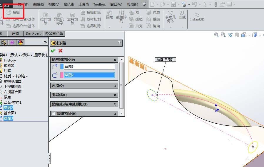 10、如下图所示,首先点击工具栏中的“扫描”图标,然后出现“扫描”对话框,然后轮廓选择“圆”(草图3),路径选择“圆弧”(草图2),最后打√,完成扫描操作。