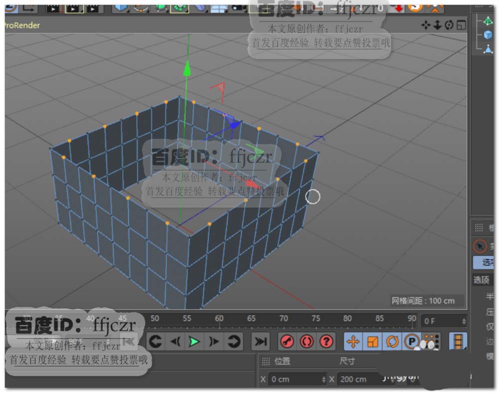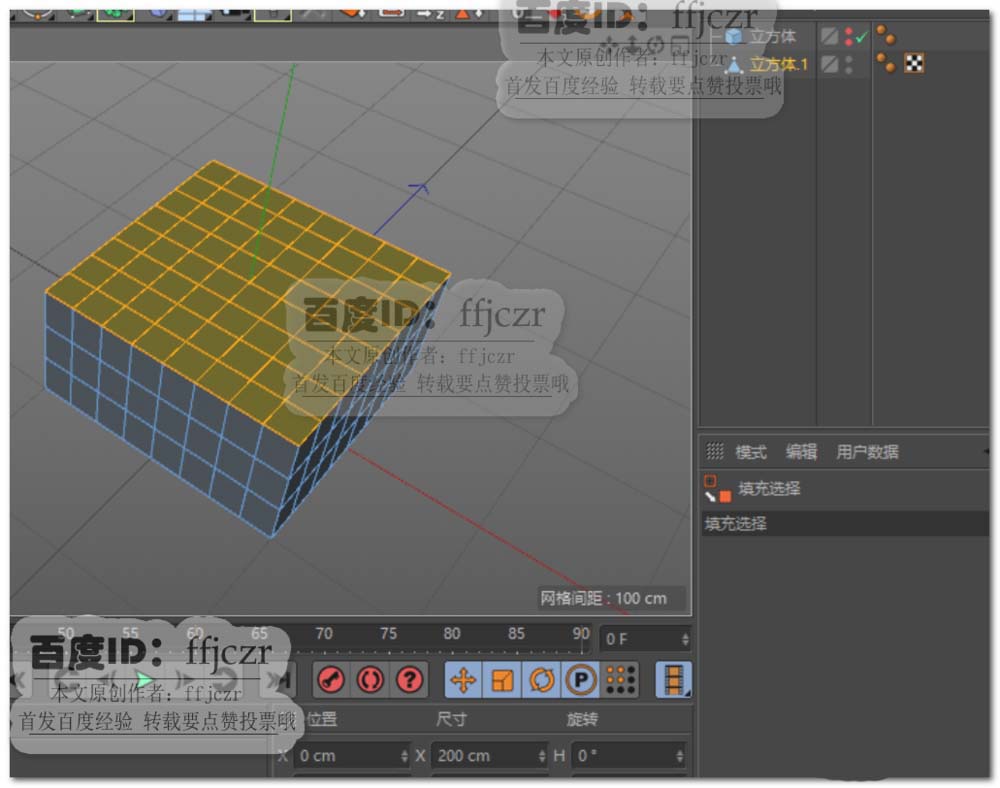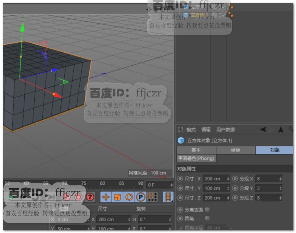 2、复制上面创建的正方体,调整参数为:200*100*200,分段为8*3*8。调整好参数后,将这正方体的底部移动到与地面重合。并转为可编辑多边形。