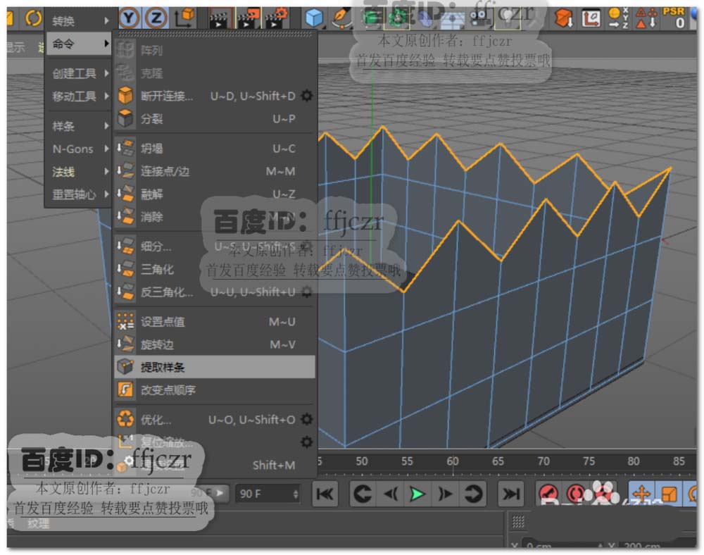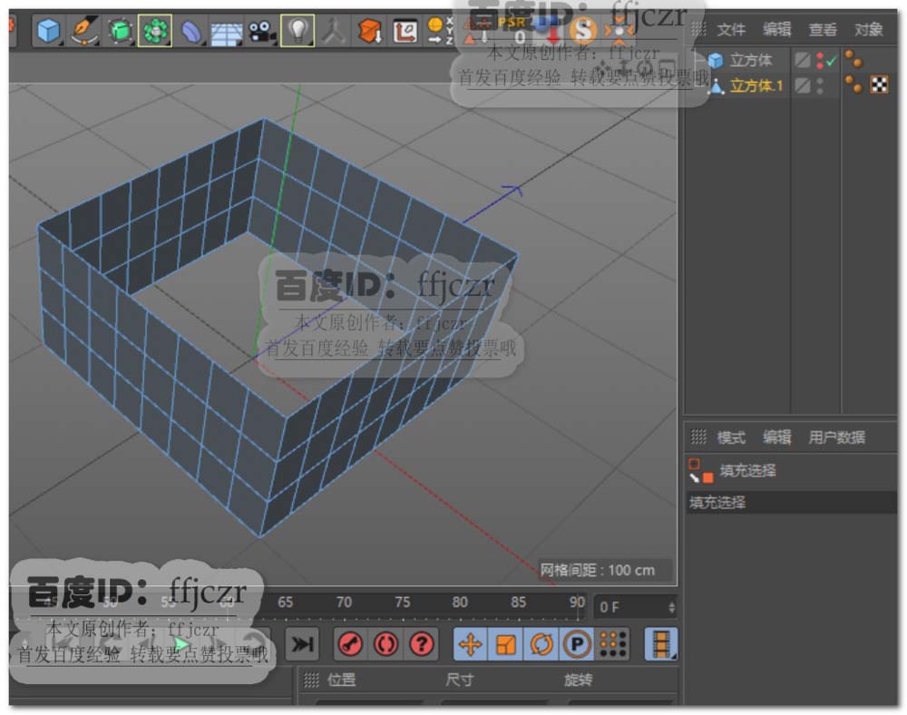3、面模式中,选中上步多边形的上下两个端面,将其删除。这里记得将多余的点优化掉。