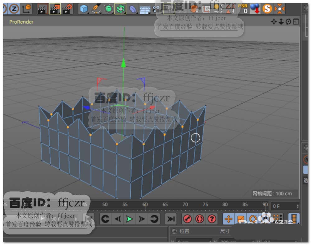 4、点模式中,对多边形顶端的一圈点进行每相隔一个点选择一个点的方式,选完一圈点。如图所示。对选中的点用移动工具,将其向下移动一段距离 。