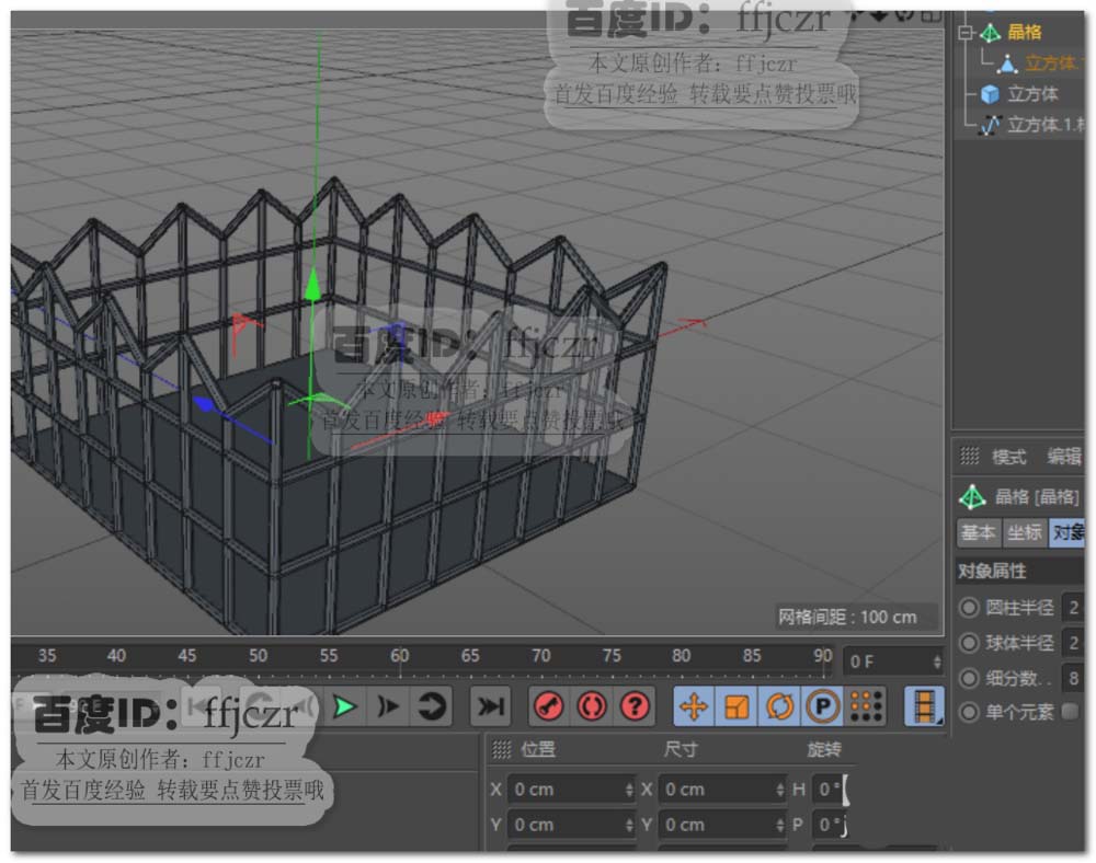 6、给第4步得到的多边形添加一个晶格命令;将晶格的圆柱半径和球体半径更改为2,细分数为8。在此得到一圈顶端呈起伏状的围栏。