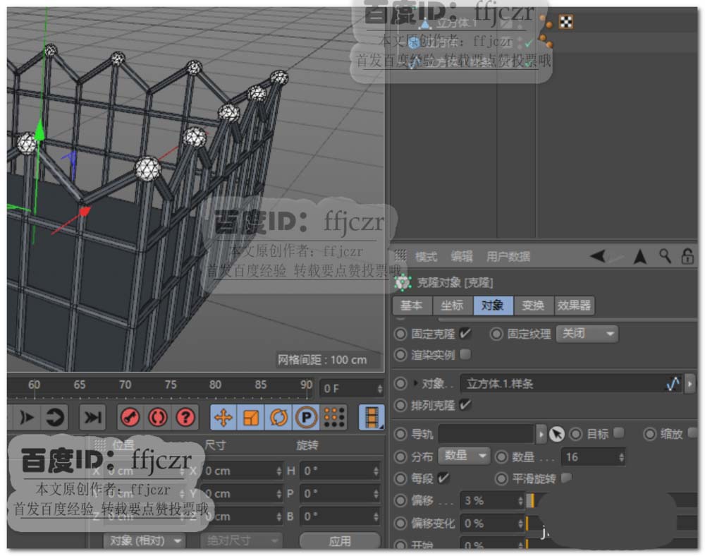 7、新建一个半径为10的圆球,分段为12,类型为二十面体;对圆球添加一个对象克隆为父级,对象为第5步抽取得到的样条线,分布方式为数量,值为16;勾选每段,调整偏移值为3%(调整偏移值可使克隆的圆球只停留在样条线的最高点上)。