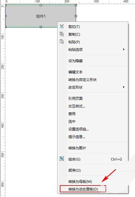 2.显示”动态面板:组件1“;置于顶层