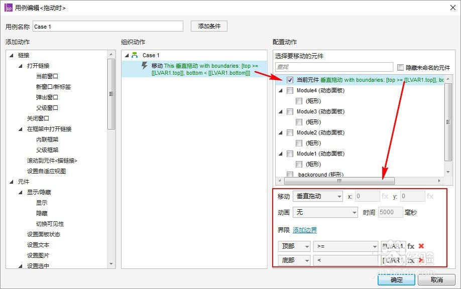 ”动态面板:组件1“的”拖动时“的Case1用例:垂直拖动“动态面板:组件1“;移动:垂直拖动;设置界限