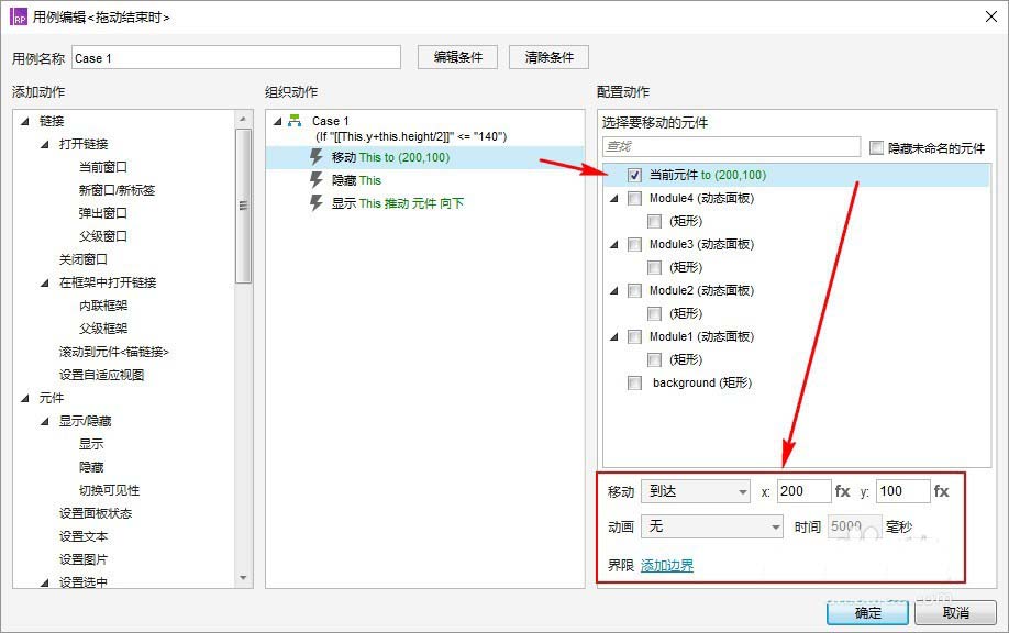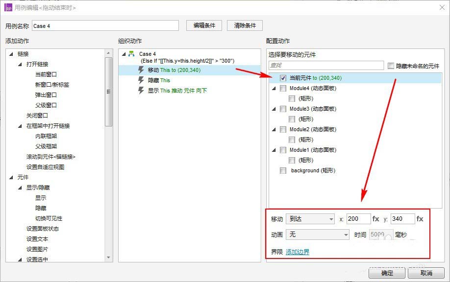 ”动态面板:组件1“的”拖动结束时“的交互就比较多,主要是判断“组件”的位置,这里只设置4个组件的移动,所以有几个临界点,分别为(200,140),(200,220),(200,300);(这里使用了绝对数值,这不是一个很好的法子,也仅为演示效果及快速实现需要;下一篇优化时,转为动态计算来回避绝对数值带来的局限性)