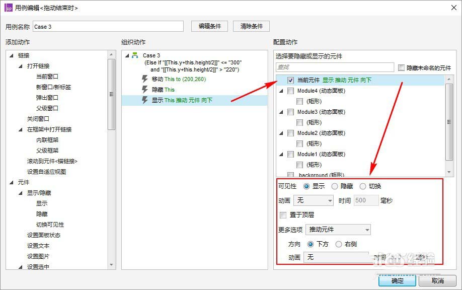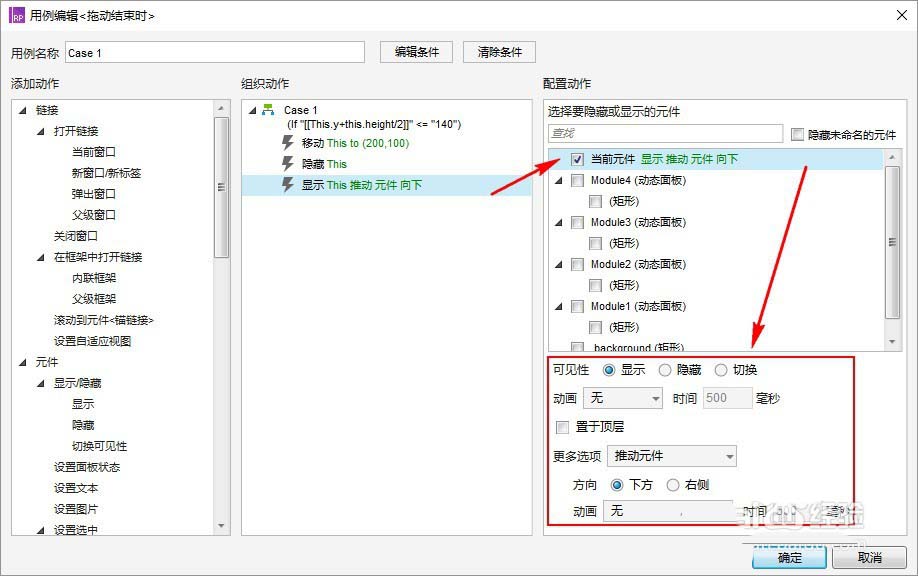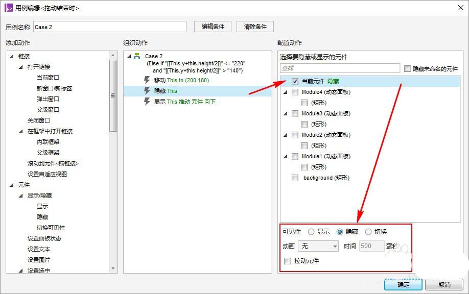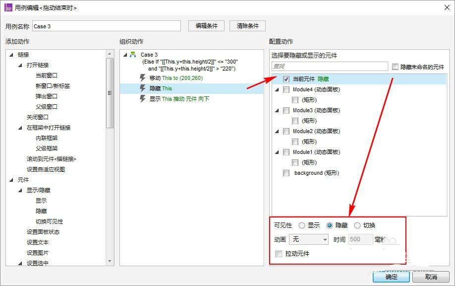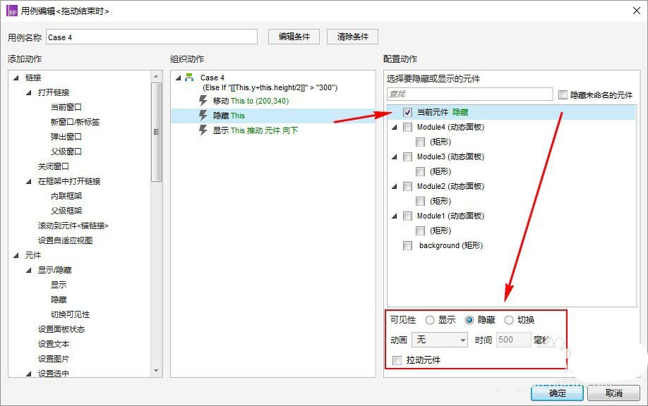 (隐藏”动态面板:组件1“时的拉动元件,可以不设置动画,设置动画及时间是为了有个“移动”的感觉,副作用就是相应的操作不能过快)