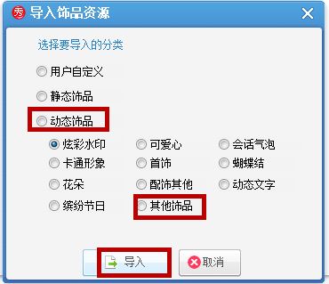 弹出窗口,点击动态饰品——其他饰品——导入,如图,