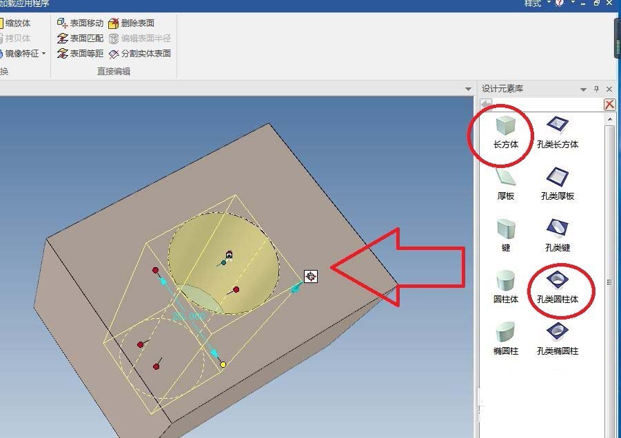 2、如下图所示,为了节省时间,直接从设计元素库中拖一个长方体和一个孔类圆柱体,然后手动修改一下孔的尺寸。