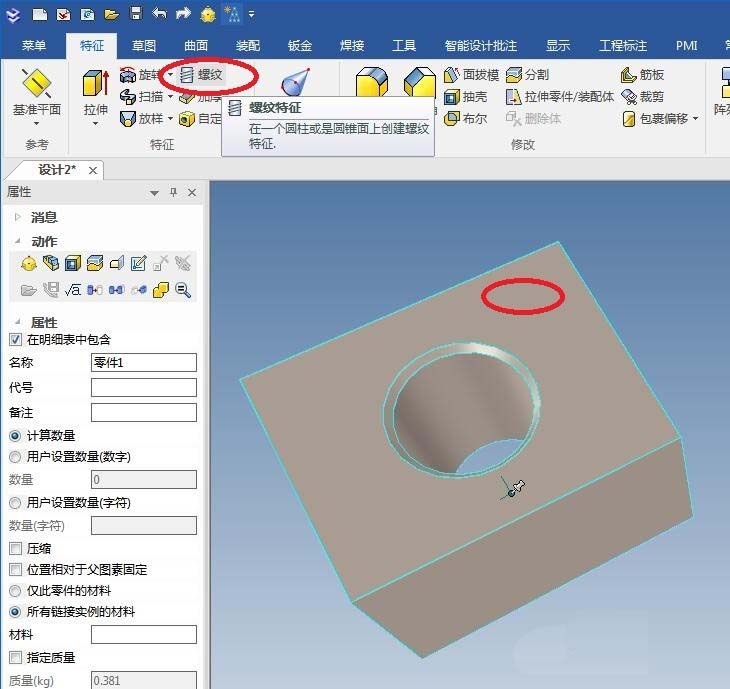 5、如下图所示,软件右边属性栏中出现了“螺纹特征”,见红色框选,红色字体:曲面,我们选择孔类圆柱体的内侧曲面(见实体中的变色的曲面)。