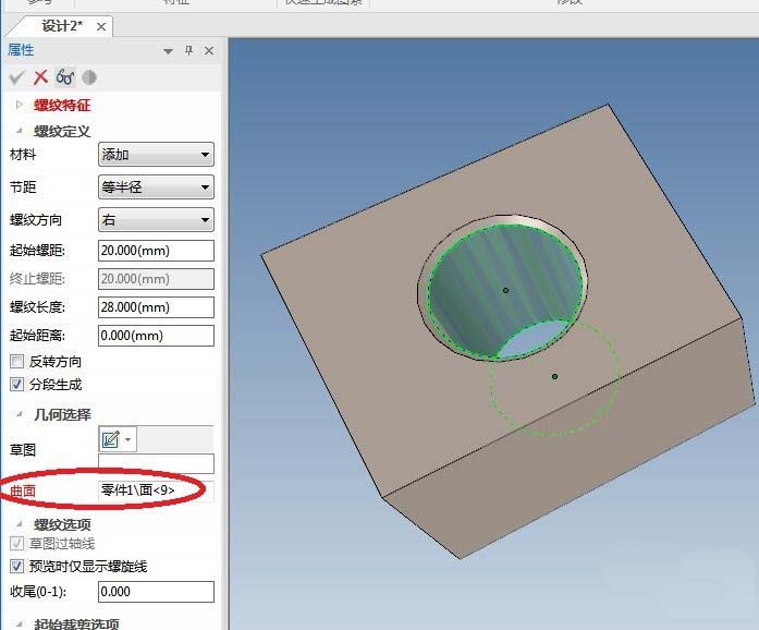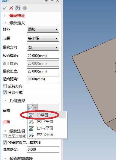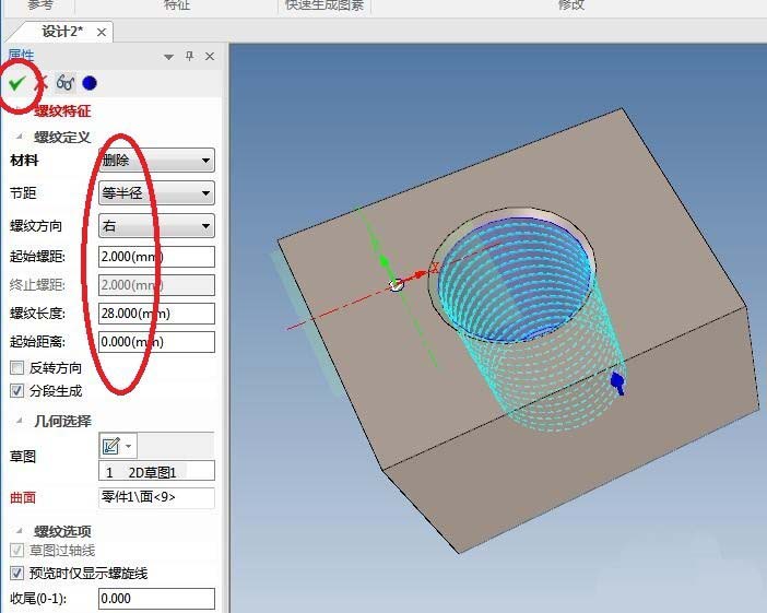 10、如下图所示,退出草图之后,在属性栏中设置螺纹特征的参数:材料改成“删除”,起始螺距:输入2,其余可以采用默认,点击“√”完成螺纹特征的创建。