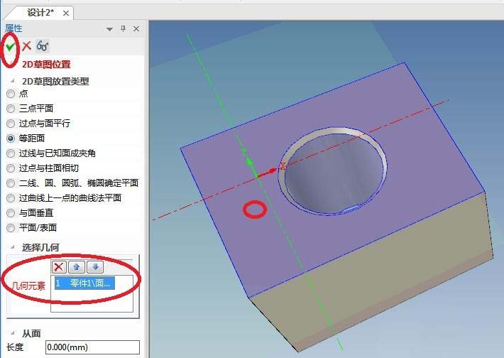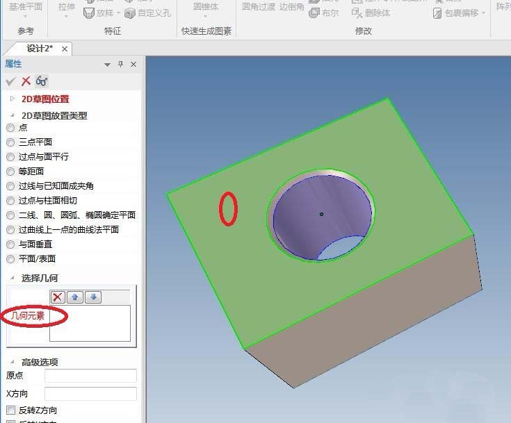 7、如下图所示,“几何元素”一栏,我们将要点击实体的上表面。