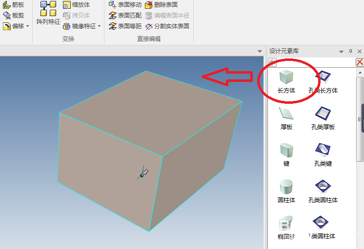 2、如下图所示,为了节省时间,我们直接从设计元素库中拖一个长方体过来,作为演示所用。