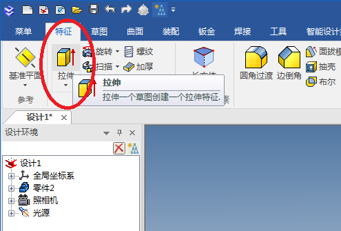 3、如下图所示,点击特征工具栏中的“拉伸”图标,激活该命令。