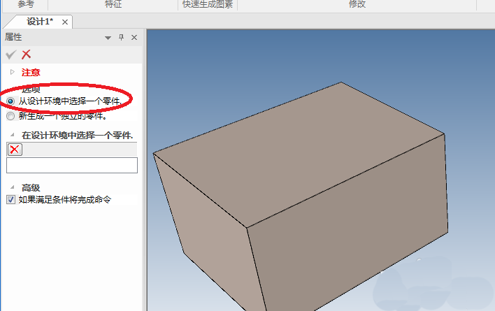 4、如下图所示,属性栏这里给我们两个选择,平常我们都是“新生成一个独立的零件”,但是很遗憾,这里我们必须采用默认的“从设计环境中选择一个零件”,所以我们点击长方体就可以了。