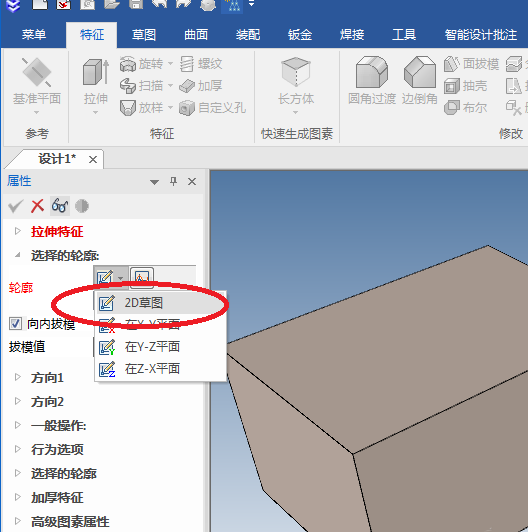5、如下图所示,属性栏中出现“拉伸特征”,轮廓一栏我们点击“2D草图”。
