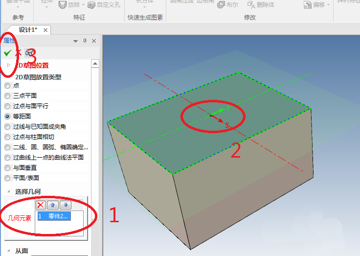 6、如下图所示,见红色框选,几何元素一栏我们用鼠标左键点击长方体的上表面的中心点,然后“√”。
