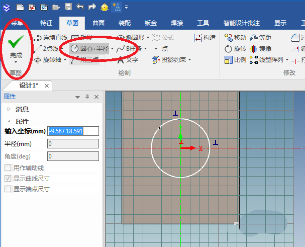 7、如下图所示,进入到草图环境,我们肯定是要画拉伸截面的草图了,为了节省时间,我们直接画一个圆凑合着演示呗,然后“完成”。