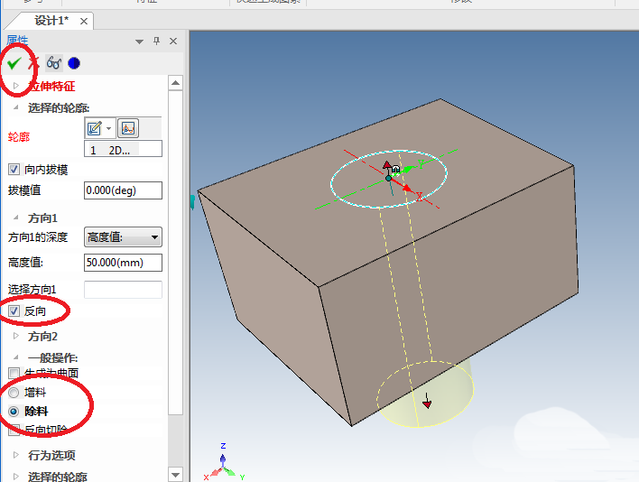 8、如下图所示,退出草图之后,看属性栏,这里有两个红色框选是重中之重,一个是“反向”,这个是调整方向,必须与实体相交,一个是“除料”,不去除材料怎么出现孔?选完这两个之后,记得“√”哦!!!