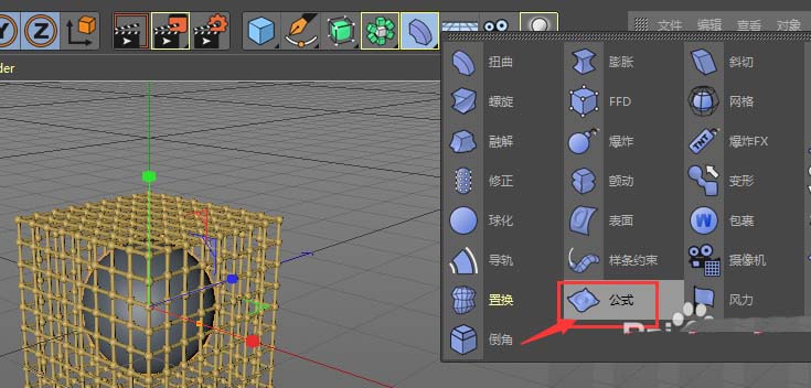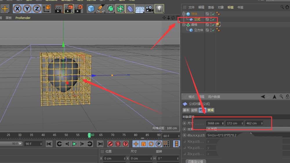 5、将公式属性添加在球体的下方,如图所示设置;然后调节公式属性下的尺寸数值,按照如图所示数值调整,做出一个类似心形的图形