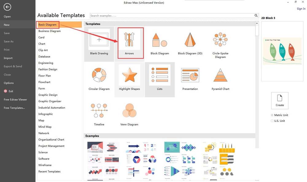 2、在基本图形Basic Diagram中找到并双击Arrows箭头;