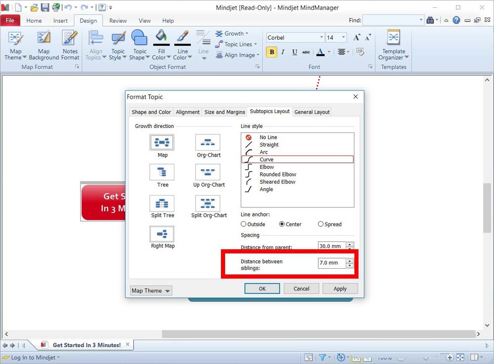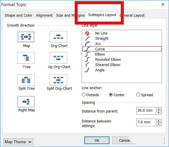 7、在弹出的【Format Topic】对话框中,选择【Subtopics Layout】,调整其中的【Distance between siblings】参数即可