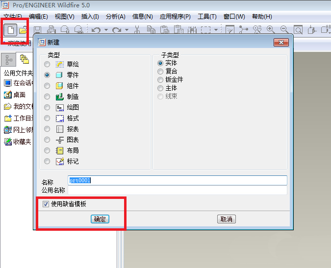 1、如下图所示,打开Pro/e5.0软件,“使用缺省模板”新建一个实体零件文件。