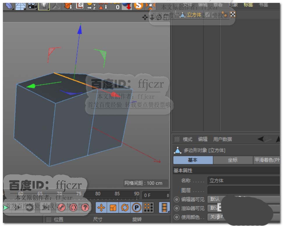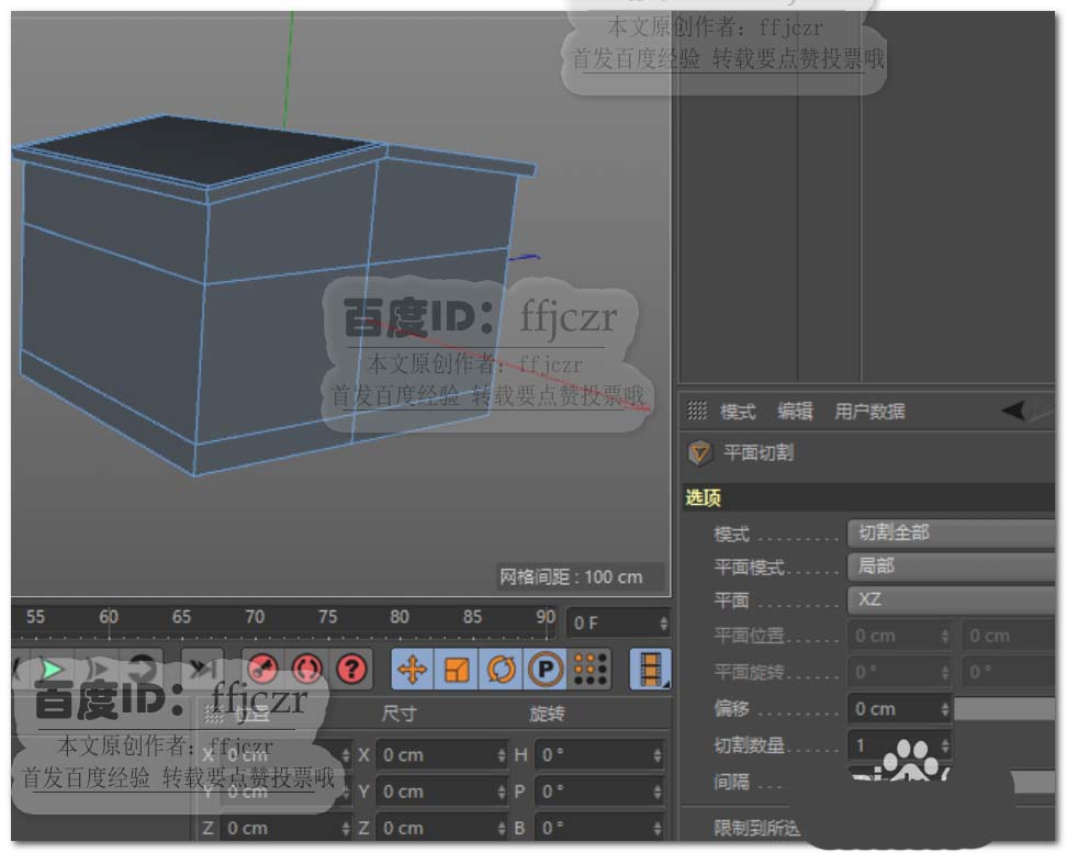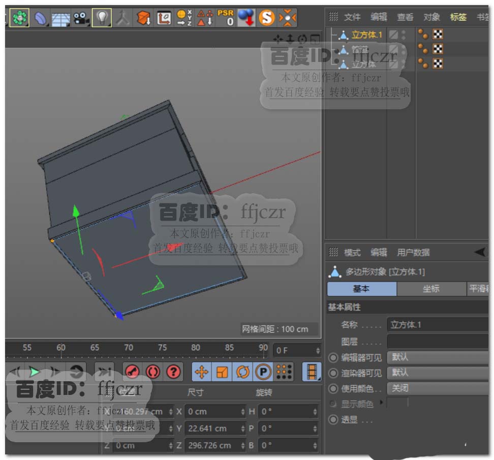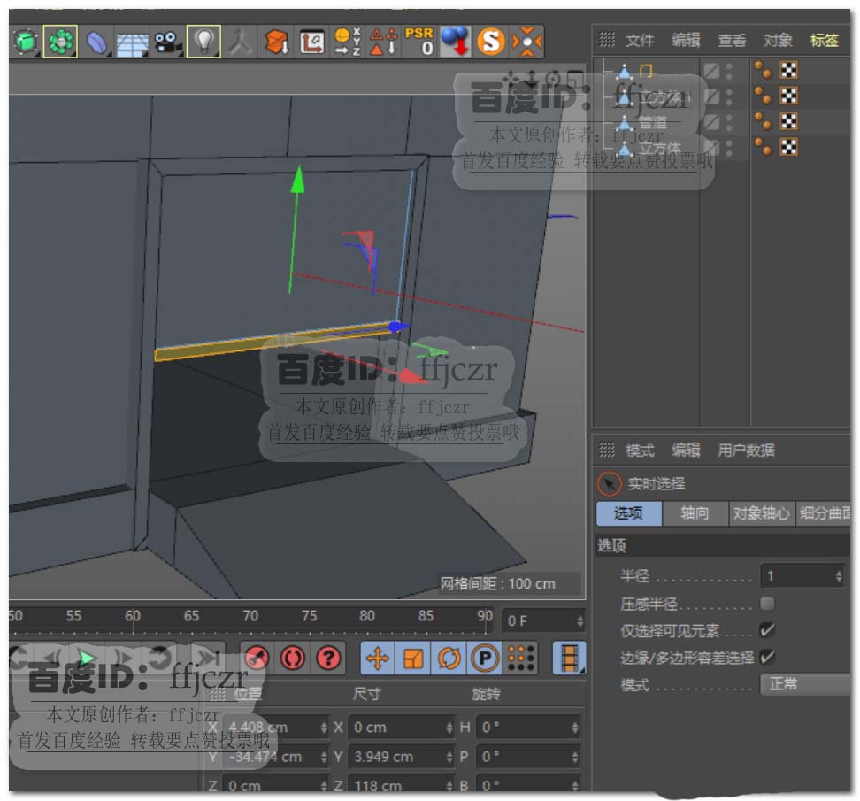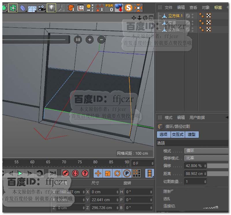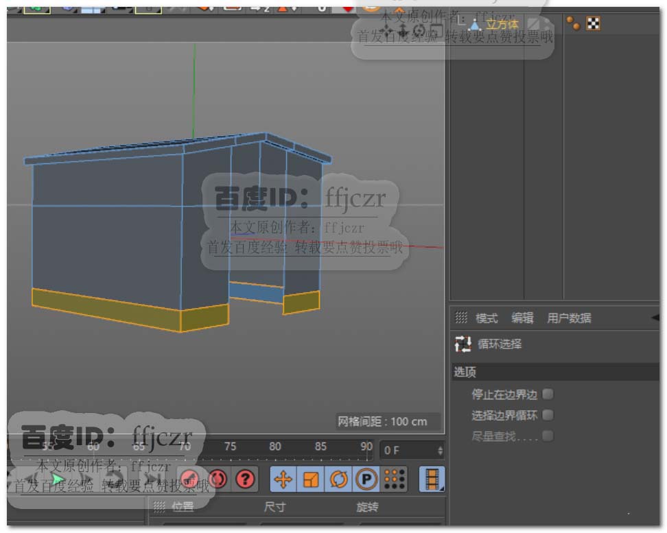 8、创建一个立方体,调成与模型的底部大小一致;厚度与模型的脚线高度一致。按照门洞大小,给立方体添加二条循环边。