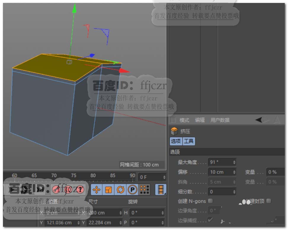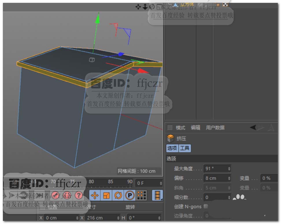 6、选中立方体底部添加循环切线后形成的一圈面,并对其向外进行挤压,偏移值为5.