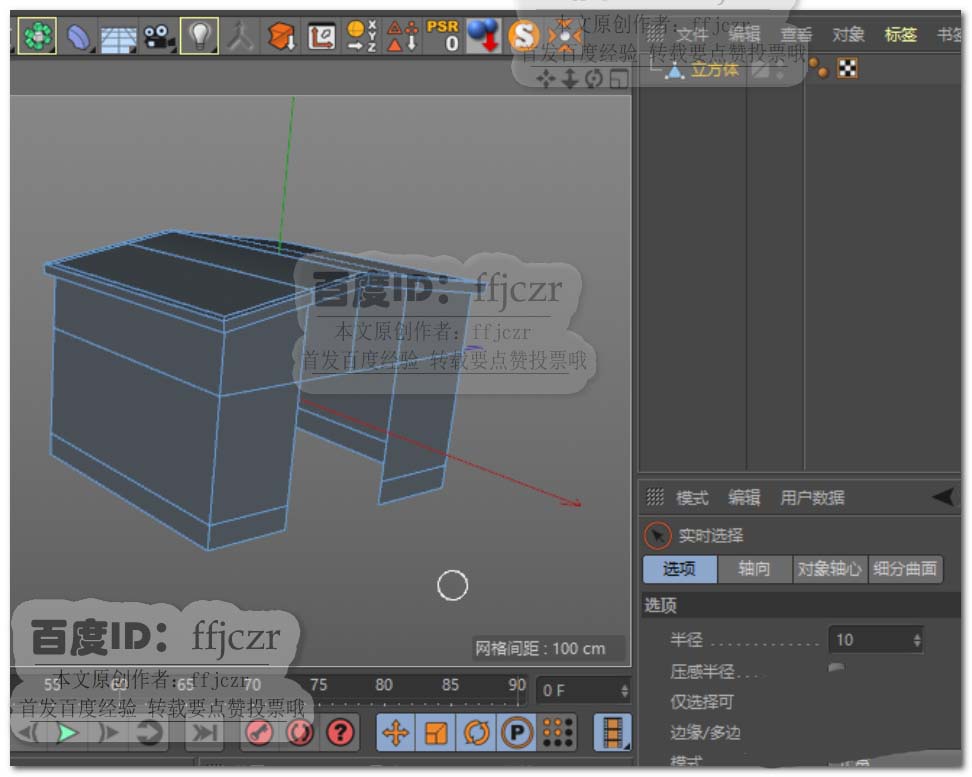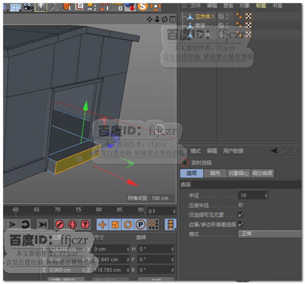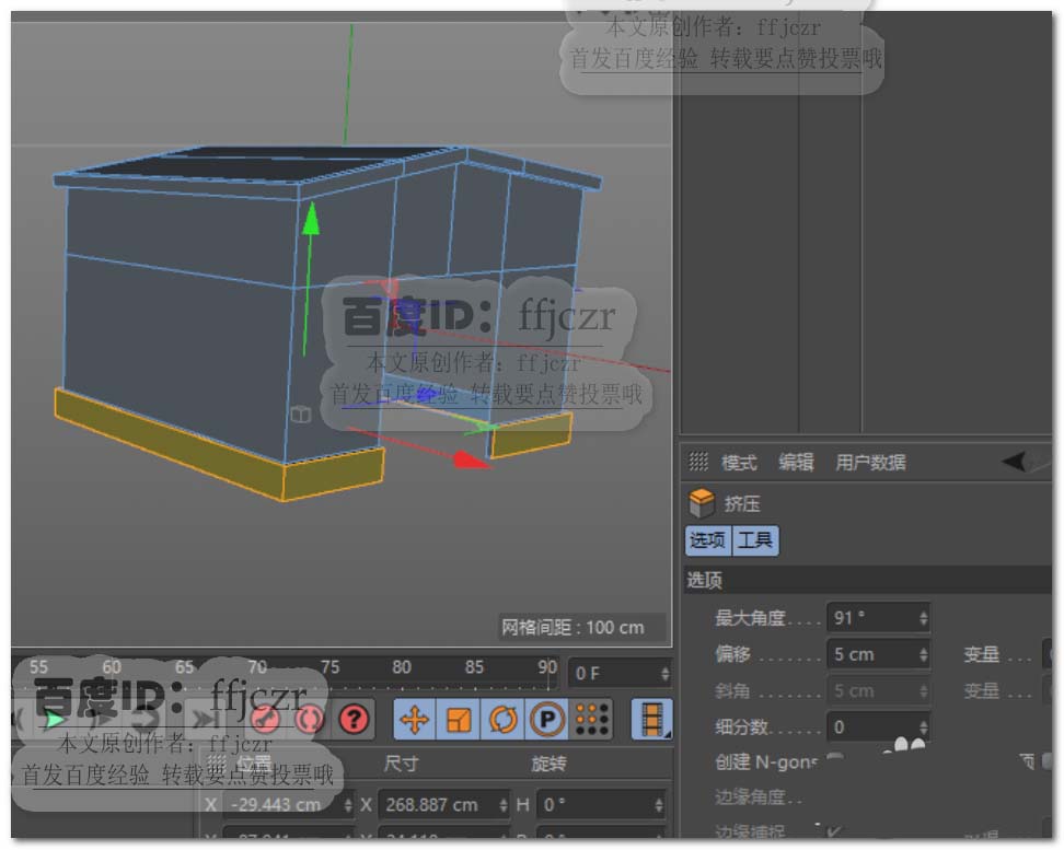 3、面模式中,选上最上端面,向上挤压10cm,形成屋顶的厚度;选中屋顶整圈侧面,向外挤压8CM,得到屋檐的效果。