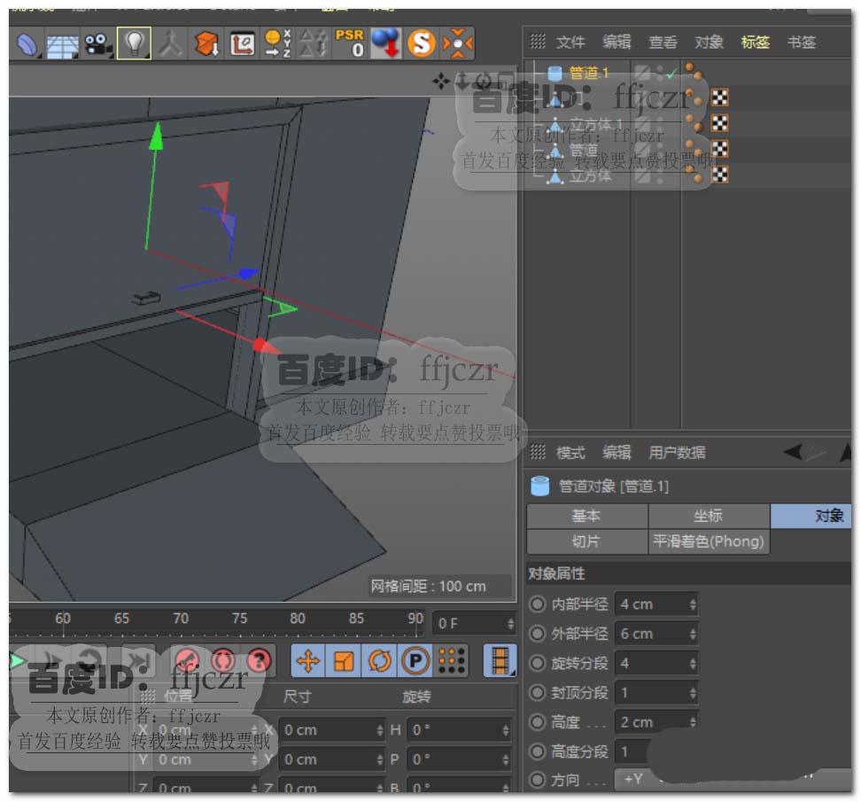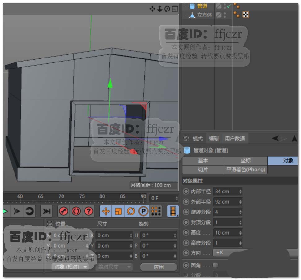 7、创建一个管道,旋转分段为4,高度为10,其它尺寸按照门洞的大小来调整。得到门框的效果。