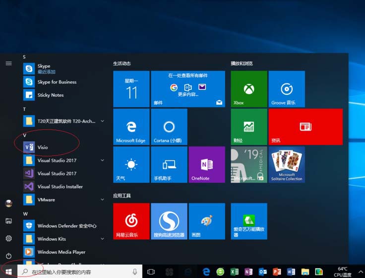 1、启动Windows 10操作系统,如图所示。点击任务栏"开始"按钮,弹出开始菜单选择"V→Visio"项。