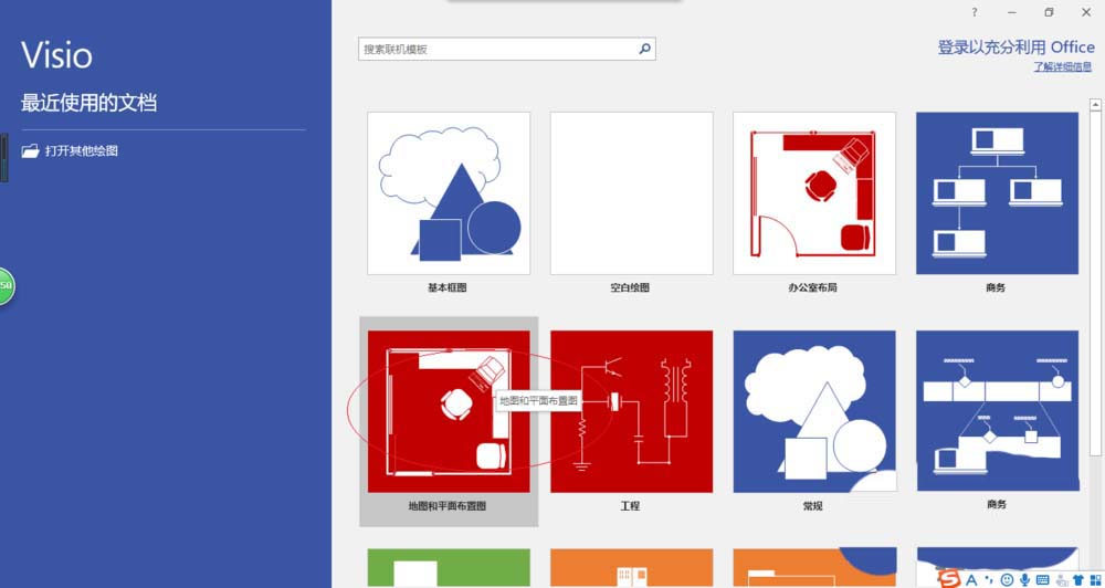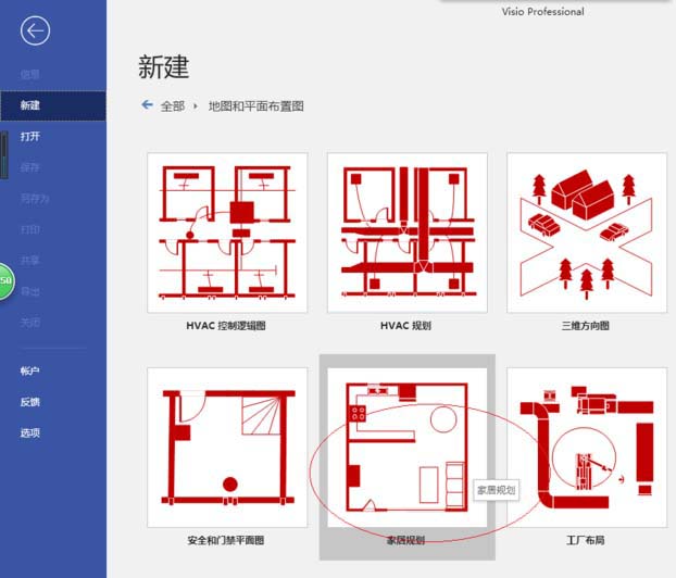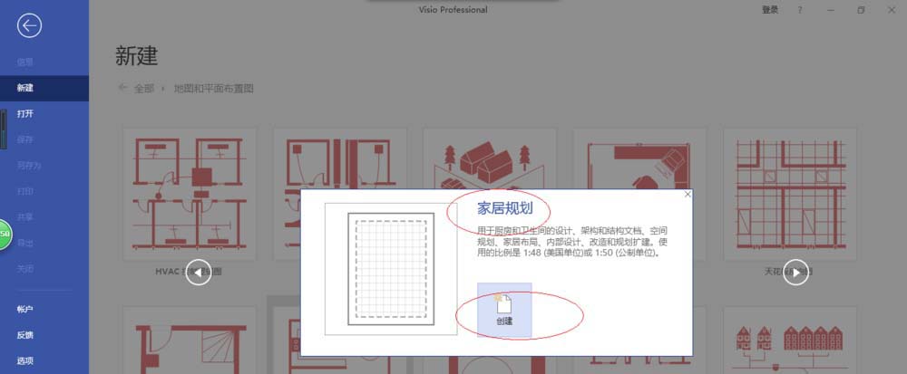 2、如图所示,唤出"Visio 2016"程序窗口。拖动右侧垂直滚动条,点击"地图和平面布置图→家居规划"图标。