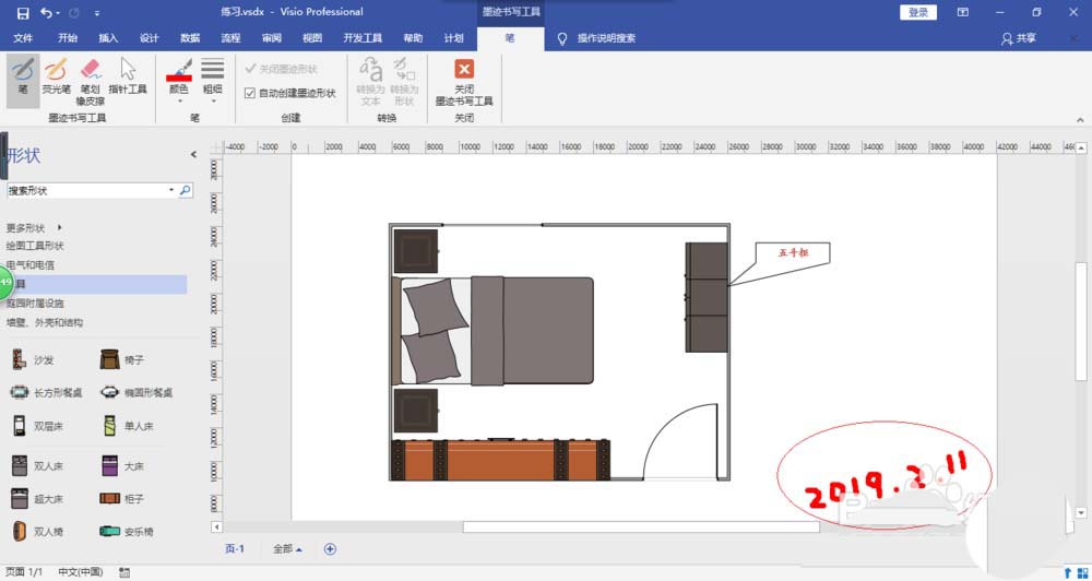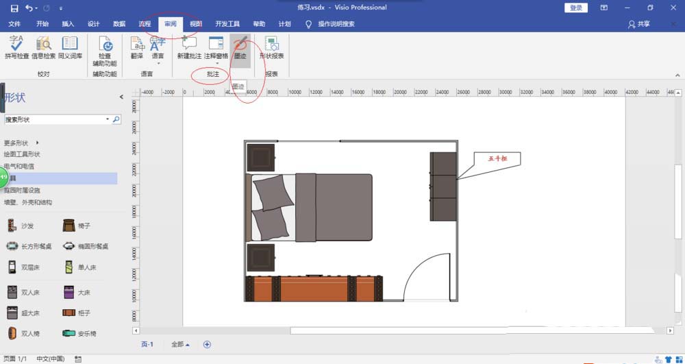 4、如图所示,唤出"Visio 2016"操作界面。按设计要求绘制家居规划图,点击"审阅→批注→墨迹"图标。