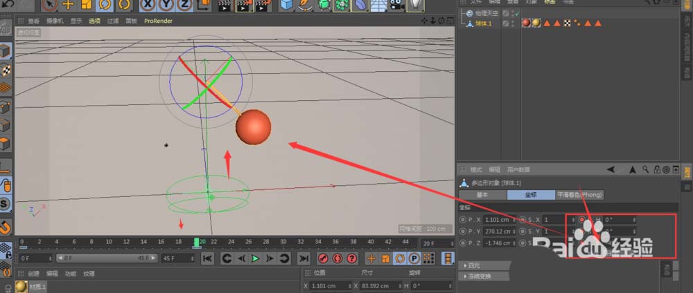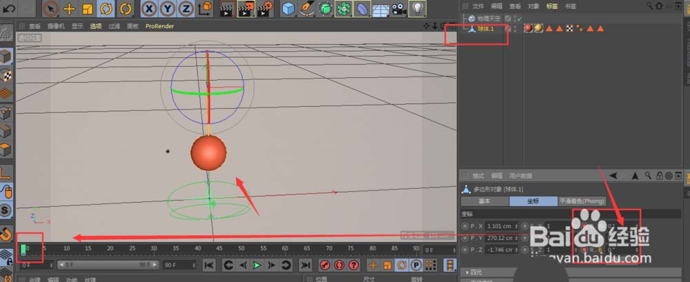 3、再创建一个球体,可以在正视图中将球体和杆对齐,根据多个不同视图模式下降杆和球体正对齐