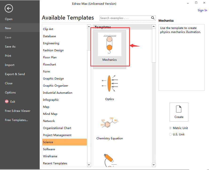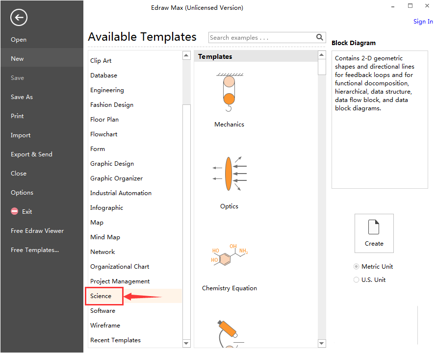 2、在可用的模板中找到并点击Science科学;