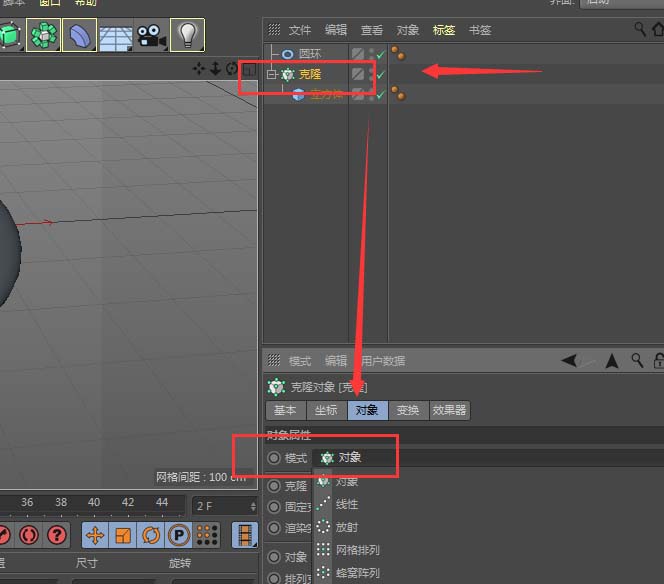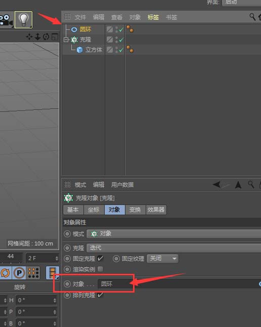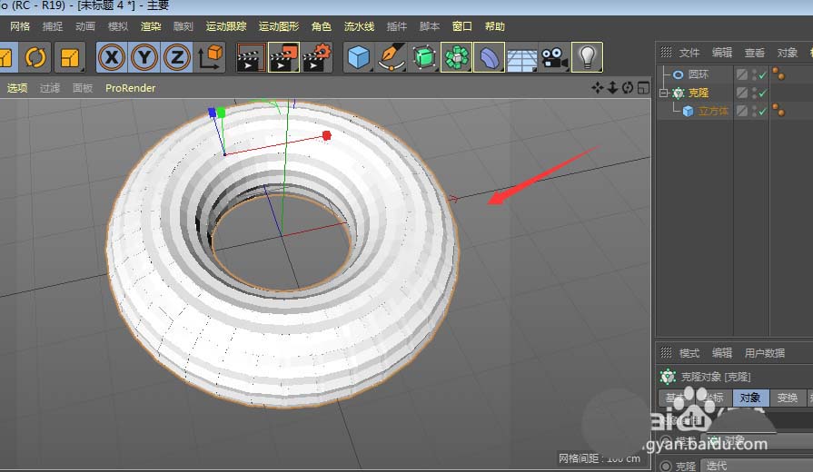 7、可以增加克隆数量以及缩放立方体大小来得到需要的效果,最后将圆环隐藏掉就只出现了线状的圆环图纹效果。