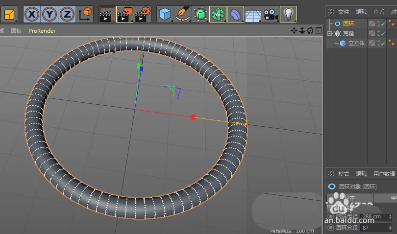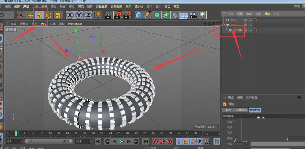 6、选中立方体,选择缩放工具,将其缩小,如图所示,这样所有的立方体就会紧贴在圆环上