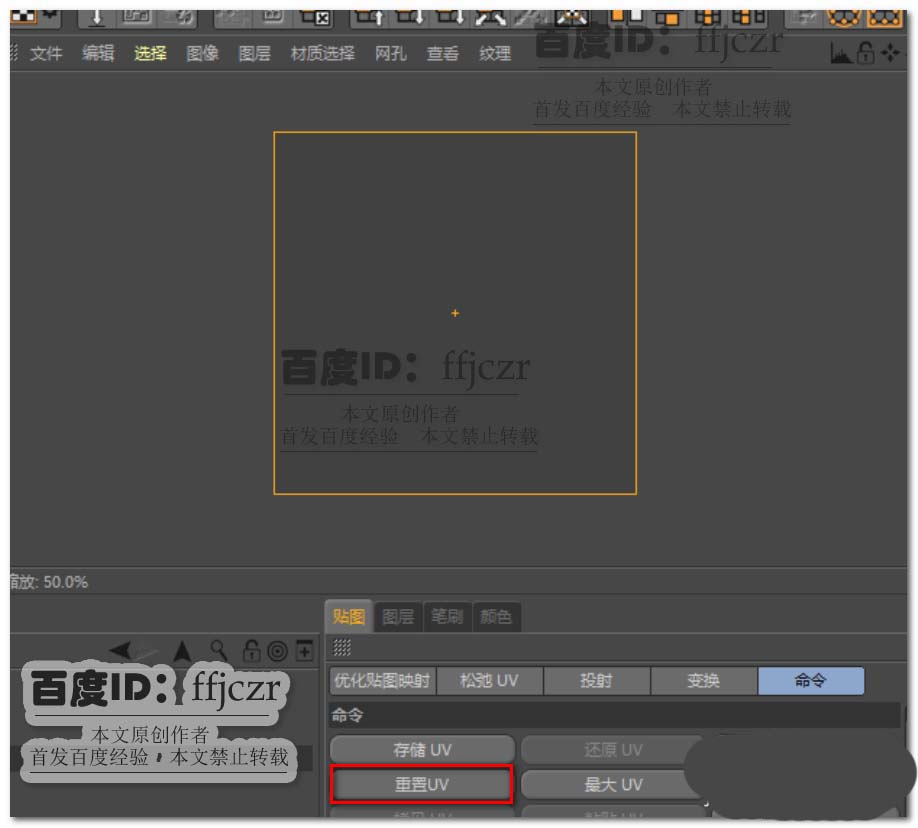 4、激活UV多边形模式,Ctrl+A选中模型所有的UV(系统自动生成的UV);点开右下角贴图栏中的命令选项:重置UV。所有UV被清除。