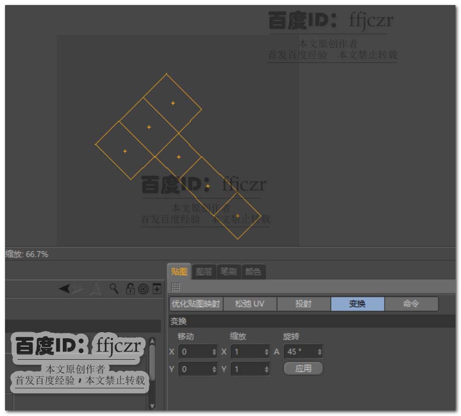 7、点开帖图栏的变换选项,将旋转角度改为45度,多点几次应用,使UV转到平直状态。