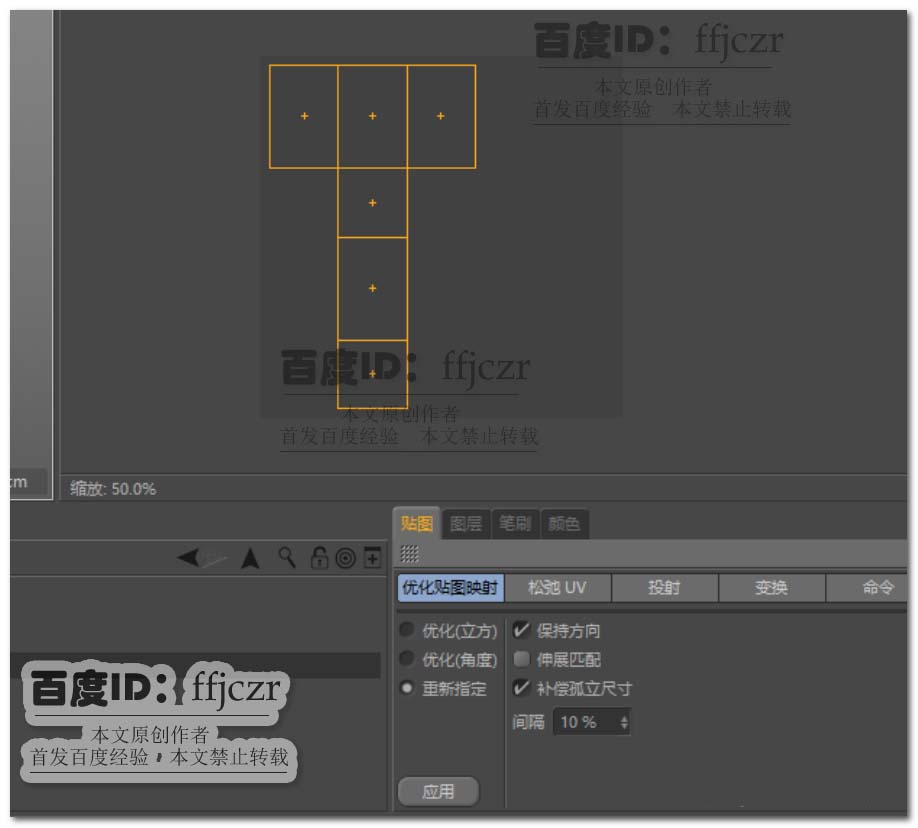 8、点开优化贴图映射选项,选择重新指定,勾选保持方向,补偿孤立尺寸,间隔值为10%。点应用,即可得到保持比例而又合理分布于画布的UV。至此长方体的UV展开完成。