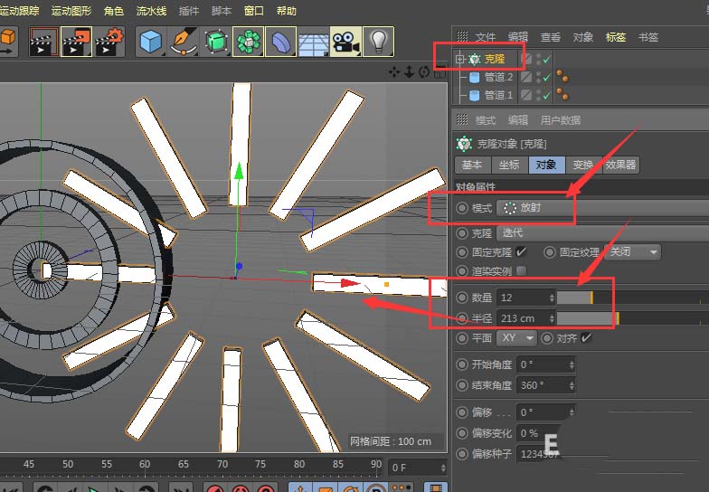6、克隆的模式属性设置为放射,调整数量大小以及半径大小