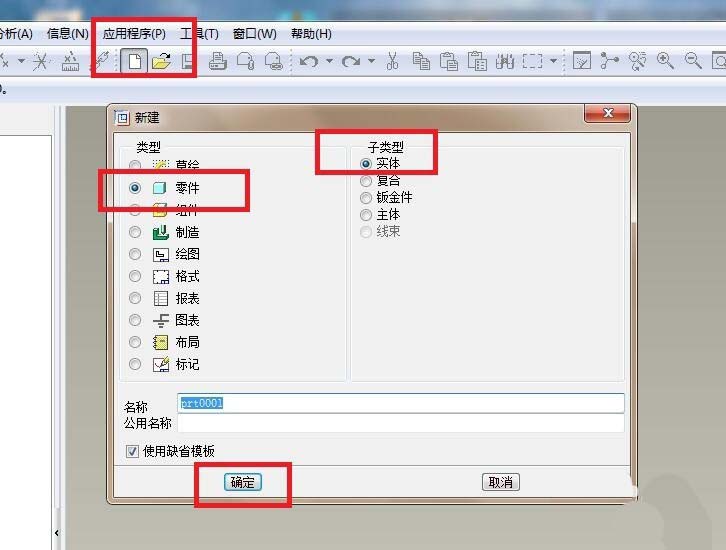 1、如下图所示,打开Pro/e5.0软件,新建一个实体零件文件,为了省时间,可以直接选用缺省模板。