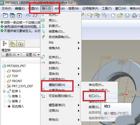 6、如下图所示,执行【插入——螺旋扫描——切口】,这是Pro/e中创建螺纹的第一步操作。