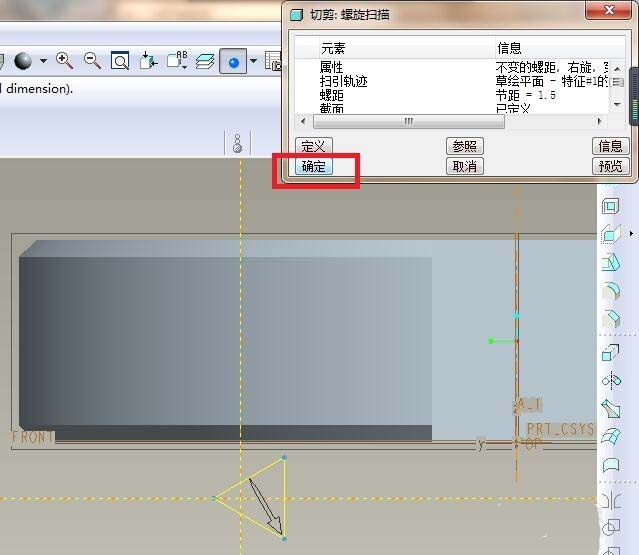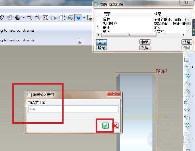 9、如下图所示,退出草绘之后有个消息输入窗口,要我们输入节距,这里就输入1.5,然后打√。