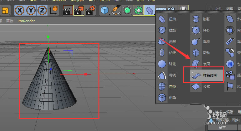 2、将样条约束拖动到圆锥的下方处理,如图所示