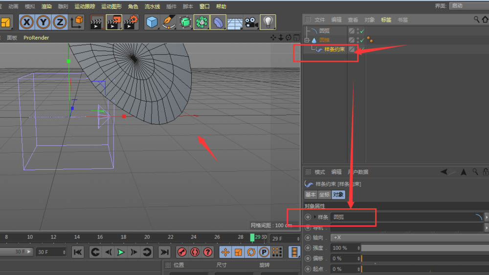 4、选择样条约束,将对象作用到建立的圆弧中,如图所示
