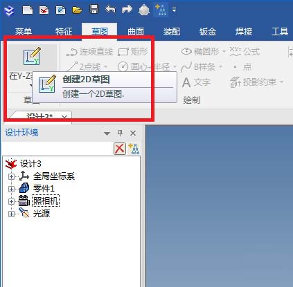 3、如下图所示,首先点击标题栏中的草图,然后在草图工具栏中点击在Y-Z基准面创建草图(因为前面拉伸的曲面实体与它垂直)。