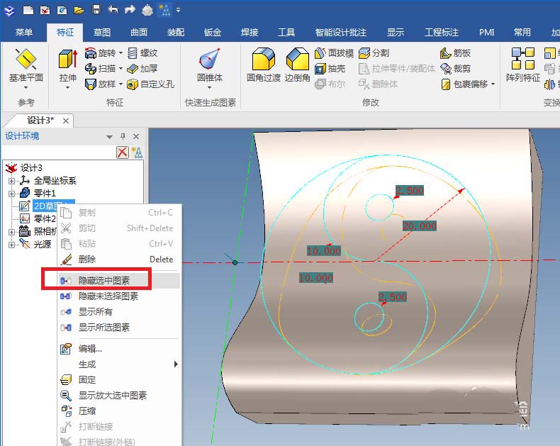 6、如下图所示,见红色框选,在设计树中将草图给隐藏起来。