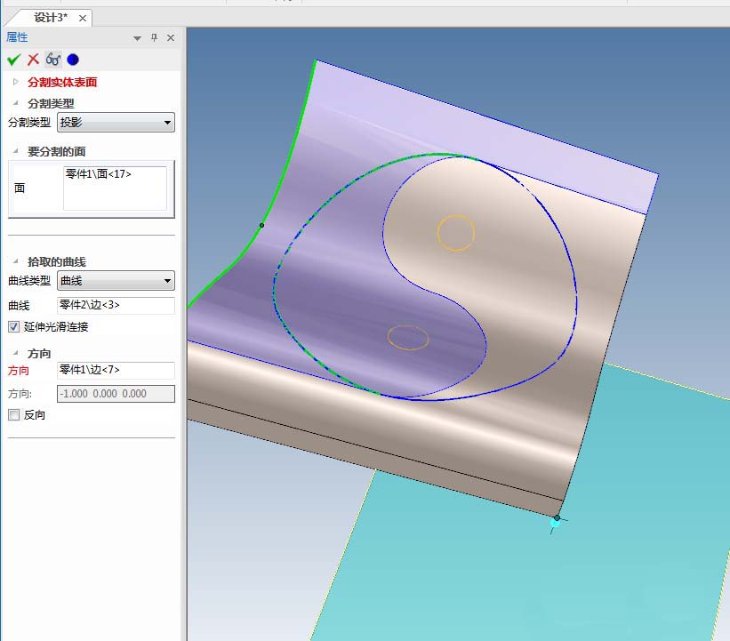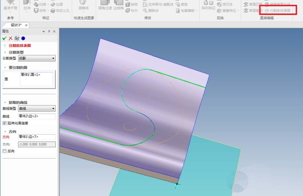 7、如下图所示,首选点击标题栏中的特征,然后点击特征工具栏中的分割实体表面图标,激活该命令,然后看软件左边的属性栏,分割类型为投影,面选择曲面,线选择曲线,方向垂直边线,打√,完成整体曲面的分割。